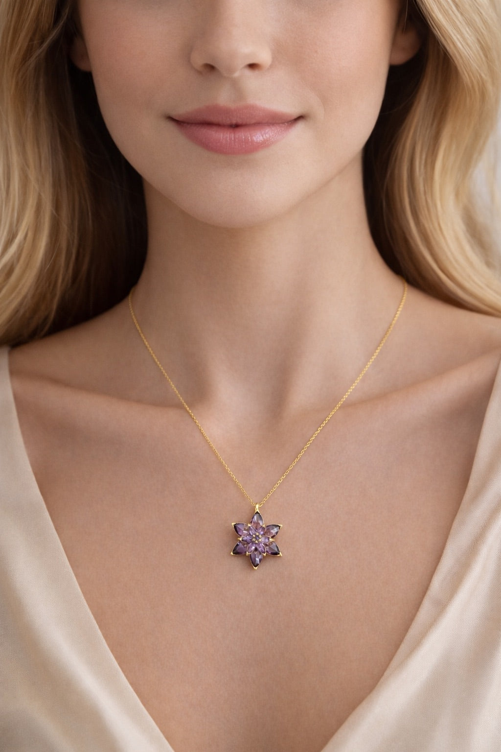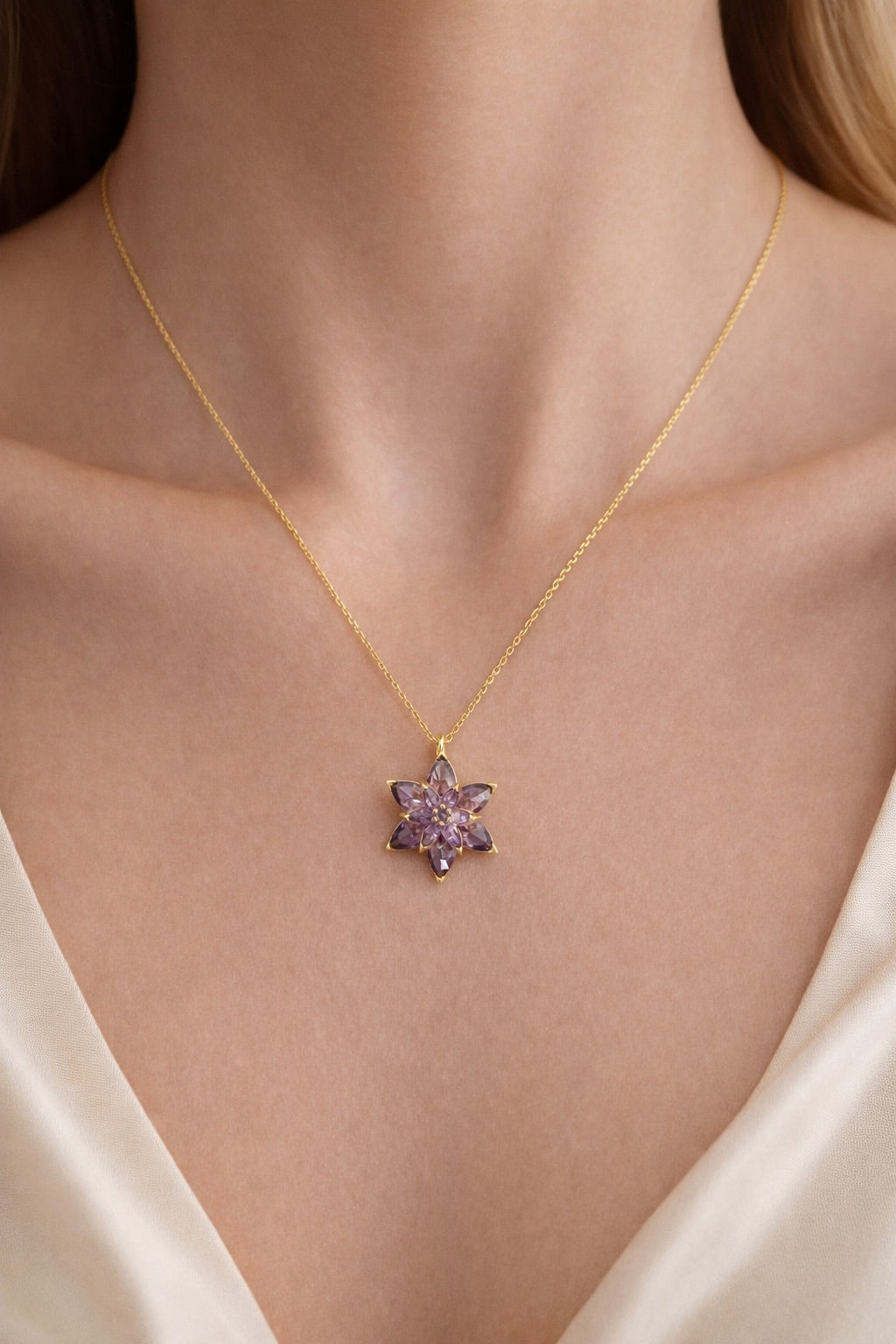 925 ayar gümüşten üretilen altın kaplama mor taşlı lotus çiçeği kolye, zarif tasarımı ve taşıdığı anlamla öne çıkan özel bir aksesuardır. Lotus çiçeği, geçmişten günümüze saflığın, yeniden doğuşun ve içsel dengenin sembolü olarak kabul edilir. Mor taş detayları ise asaleti, bilgeligi ve ruhsal derinliği temsil eder.